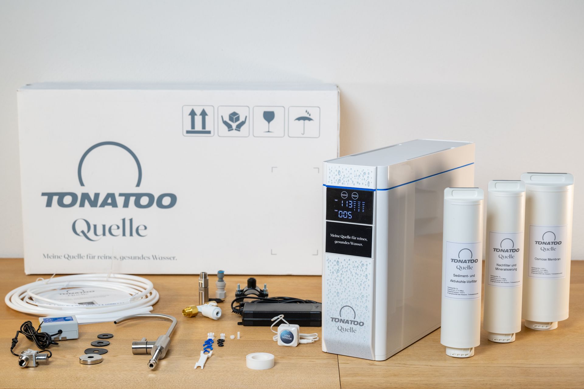 Alles drin, was Du brauchst: Die TONATOO® Quelle, Montagezubehör und ein hochwertiger Edelstahlwasserhahn